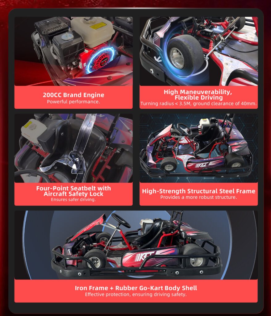 This go-kart is ideal for those seeking a reliable and stylish vehicle for go-kart racing or leisure driving. Its combination of a powerful engine, sturdy construction, and eye-catching design makes it a great choice for drivers of all skill levels.