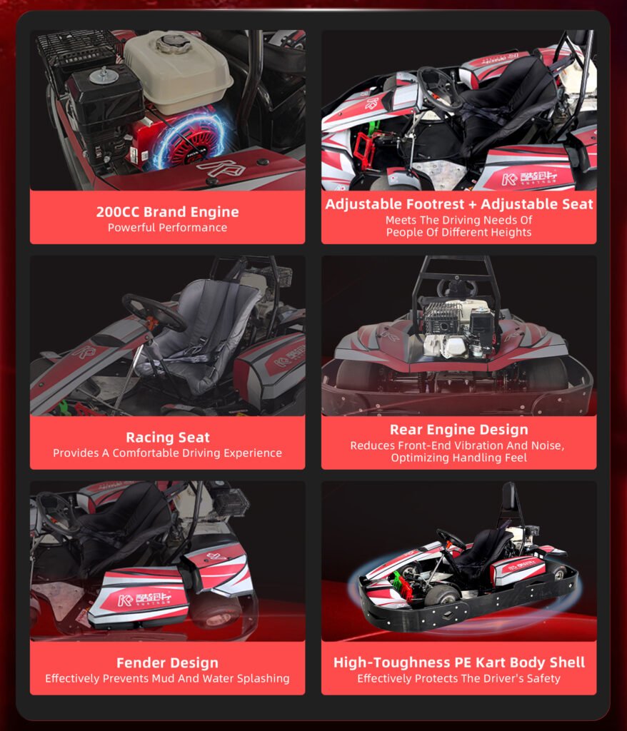 This go-kart features a striking red and black color scheme, accented with high-tech metallic gray. Its streamlined body boasts sharp, dynamic lines and a sleek, compact silhouette, seamlessly blending mechanical aesthetics with the thrill of the racetrack. The overall design resembles a beast poised to strike, visually capturing the raw power and intensity of go-kart racing.